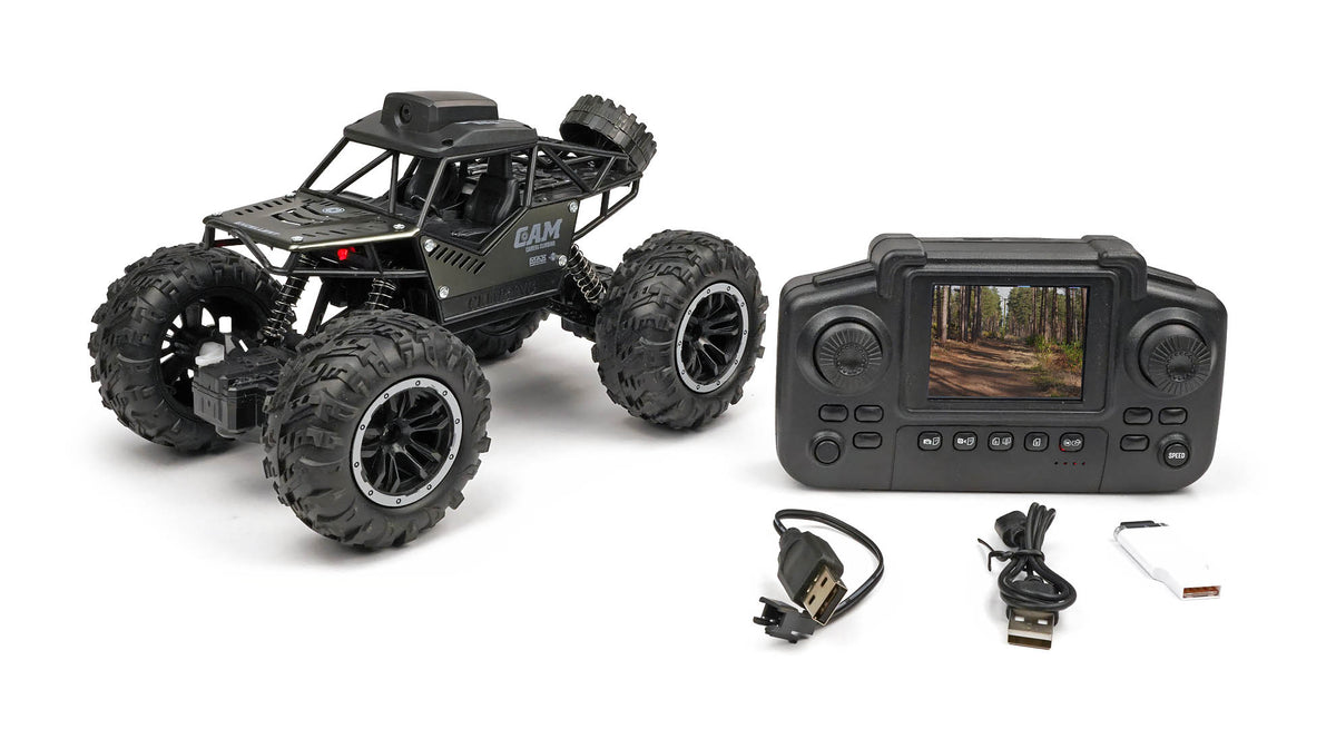 Featuring a high-quality screen on it's transmitter, you can drive around and remotely view what's in front,. This RC truck allows you to race multiple vehicles at once without interference. A powerful motor, front and rear geared differentials, and coil-sprung shock absorbers work together to deliver smooth and responsive handling. The 35-degree climb angle and oversized wheels with patterned tires ensure superior traction and stability on any surface.